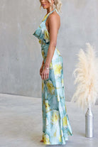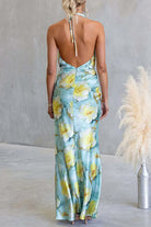 Halter Cowl Neck Open Back Floral Print Satin Maxi Dress