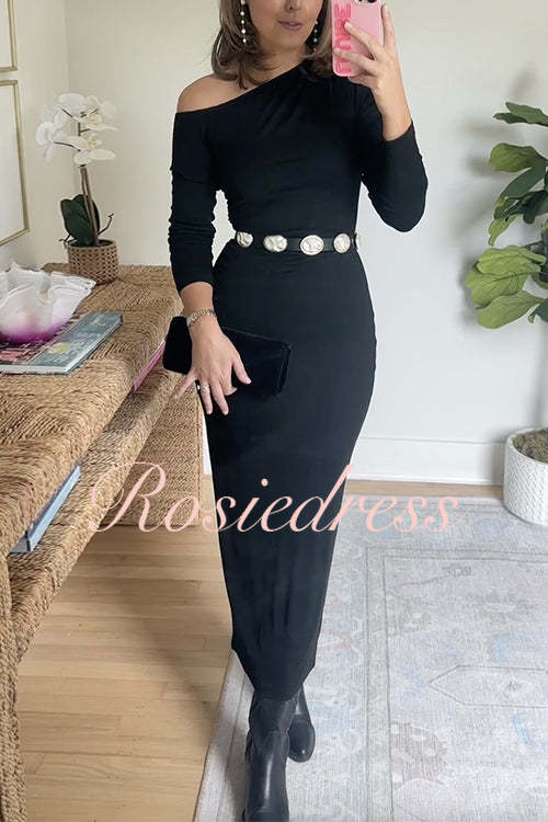Asymmetrical Shoulder Long Sleeves Bodycon Midi Dress