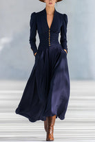 This V Neck Maxi Dress features long sleeves and elegant buttons for a refined look. Its ruched waist accentuates your silhouette, creating a flattering fit that enhances your confidence. Perfect for any occasion, the flowing maxi length combines comfort with style, making it an effortless choice to elevate your wardrobe.