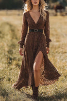 Wrap V Neck Long Sleeves Slit Lace Maxi Dress