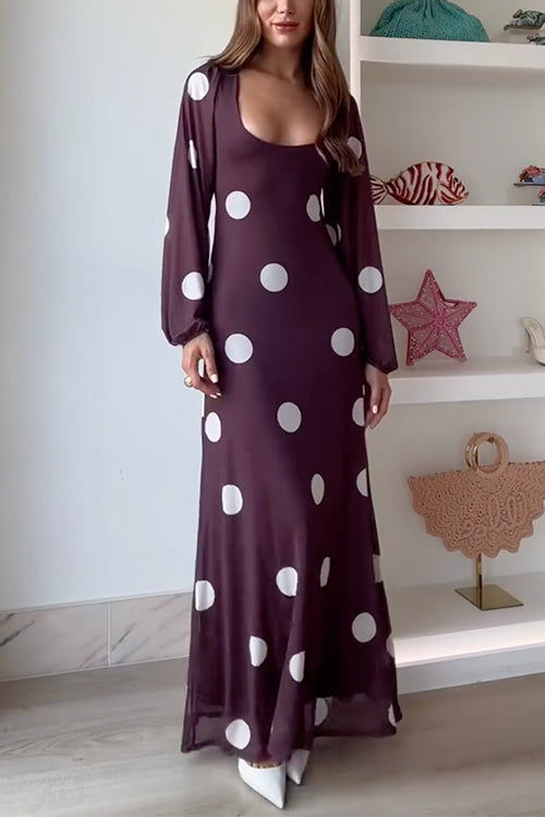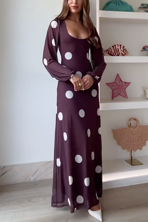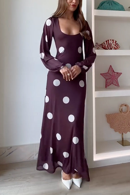 U Neck Long Sleeves Polka Dot Maxi Dress