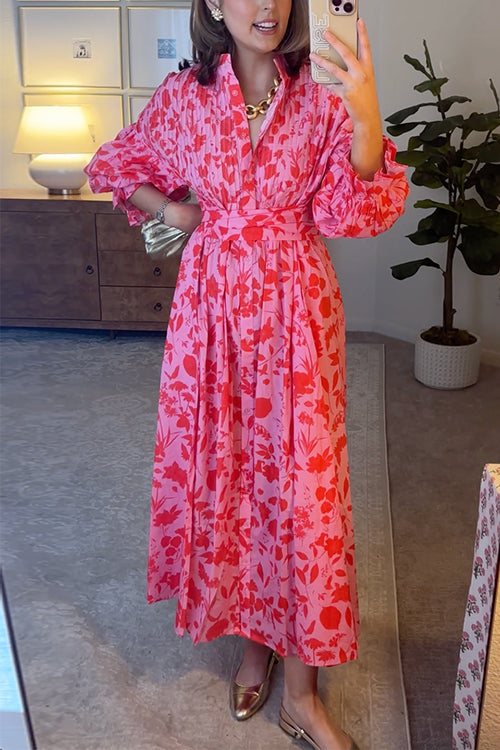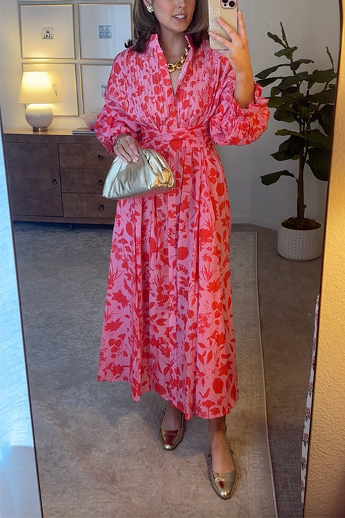 Balloon Long Sleeves Button Down Floral Print Maxi Dress