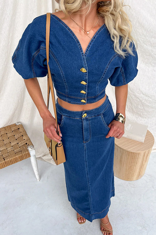 This V Neck Puff Short Sleeves Crop Denim Top combines timeless denim with a modern, feminine twist. The flattering V-neckline and stylish puff sleeves create a chic look, while the cropped length accentuates your silhouette. Perfect for day-to-night wear, this top adds a playful yet sophisticated edge to any outfit.