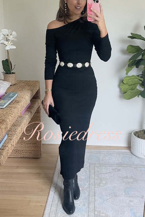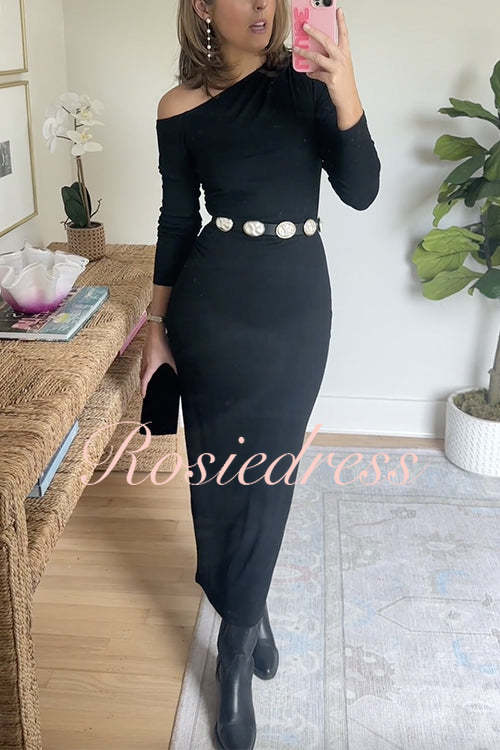 Turn heads effortlessly with the Asymmetrical Shoulder Long Sleeves Bodycon Midi Dress. Featuring a unique asymmetrical neckline and sleek long sleeves, this dress sculpturally enhances your silhouette with its cinched waist and figure-hugging fit. The elegant midi length ensures a chic and refined look, perfect for making a lasting impression at any event. Embrace confidence and style in this standout piece.