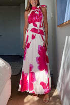 Bow Neck Sleeveless Floral Print Pleated Maxi Dress