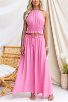 Discover the perfect balance of elegance and edge with this halter neck top that features a striking open back design. The ruffled hem brings playful sophistication to your silhouette, making it ideal for anyone seeking a standout piece. Whether you're dressing up for a special occasion or elevating your everyday style, this top delivers instant impact with its flattering neckline and eye-catching details. The breathable fabric keeps you comfortable while you command attention. Add this versatile essential to your collection and unlock endless styling possibilities that showcase your unique personality.