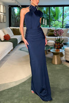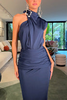 Make a bold statement in this captivating halter one-shoulder maxi dress. Crafted from sumptuous satin, the fabric glides gracefully against your skin while elegant ruching sculpts and flatters your figure. The asymmetrical halter neckline creates an eye-catching focal point that exudes confidence and sophistication. Whether you're attending a gala, wedding, or upscale dinner, this dress delivers red-carpet worthy glamour. The flowing maxi length ensures effortless grace with every step, making it the ultimate choice for anyone who refuses to blend into the background.