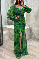 Rosiedress Off Shoulder Rhinestones Detail Printed Slit Pleated Maxi Dress