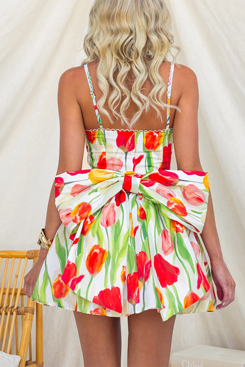 Watercolor Tulip Print Fit and Flare Mini Dress with Statement Back Bow