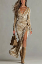 V Neck Long Sleeves Slit Crushed Velvet Maxi Dress